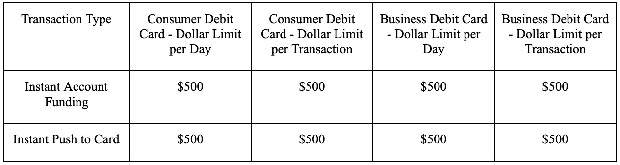 If enabled by Platform, you may fund your Account instantly using an eligible debit card (Instant Account Funding) or instantly transfer funds from your Account to an eligible debit card (Instant Push to Card). You will have to link the debit card to the Account using the Paga App and provide such additional information requested on the Paga App regarding the transaction, and the debit card must be enabled by the payment network for instant transfer services. These transactions operate through card networks (Visa Direct and Mastercard MoneySend). You will be charged a $2 transaction fee for each Instant Push to Card Transaction and a $1 transaction fee for Instant Account Funding. Limits for Instant Account Funding and Instant Push to Card transactions are set forth below. These limits are subject to periodic review and to change based on your Account history, activity, Paga’s reviews and other factors. We reserve the right to allow you to conduct transactions in excess of the limits at any time without prior notice. Additional limits may be imposed by other financial institutions involved in Instant Account Funding and Instant Push to Card transactions that are outside of our control.