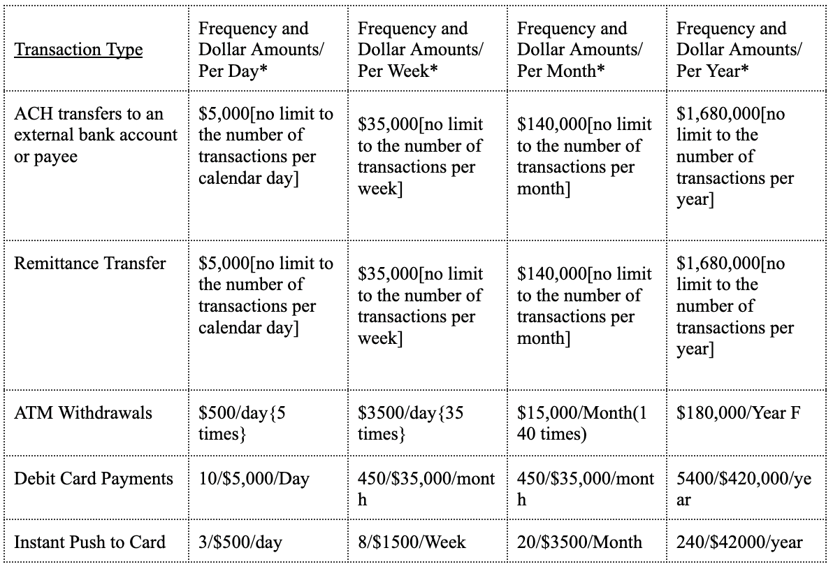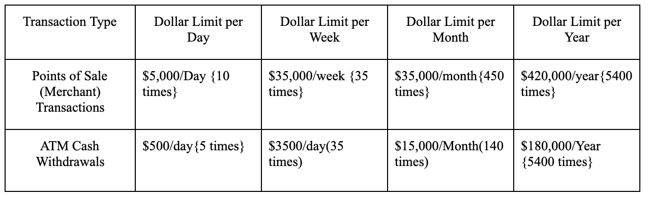 Spending and Withdrawals Limits. You may use your Card to withdraw cash from your Account, pay for purchases at places that have agreed to accept the Card, and pay bills directly from your Account in the amounts and on the days you request. There are transactional (dollar) limits per day imposed on your Card. The transactional limits imposed on your Card are provided in the table below. These limits are the maximum amounts that you can spend with your Card per day and are subject to periodic review and to change based on your Account history, activity, Paga’s reviews and other factors. We reserve the right to allow you to transact higher volume than the limits defined herein at any time without prior notice. Because of the limitations imposed by some ATMs and in the event of equipment failure or unavailability, you may not be able to withdraw or to access funds even though you have not exceeded these limitations. The daily period to which the transactional limits apply are on a rolling 24-hour basis.