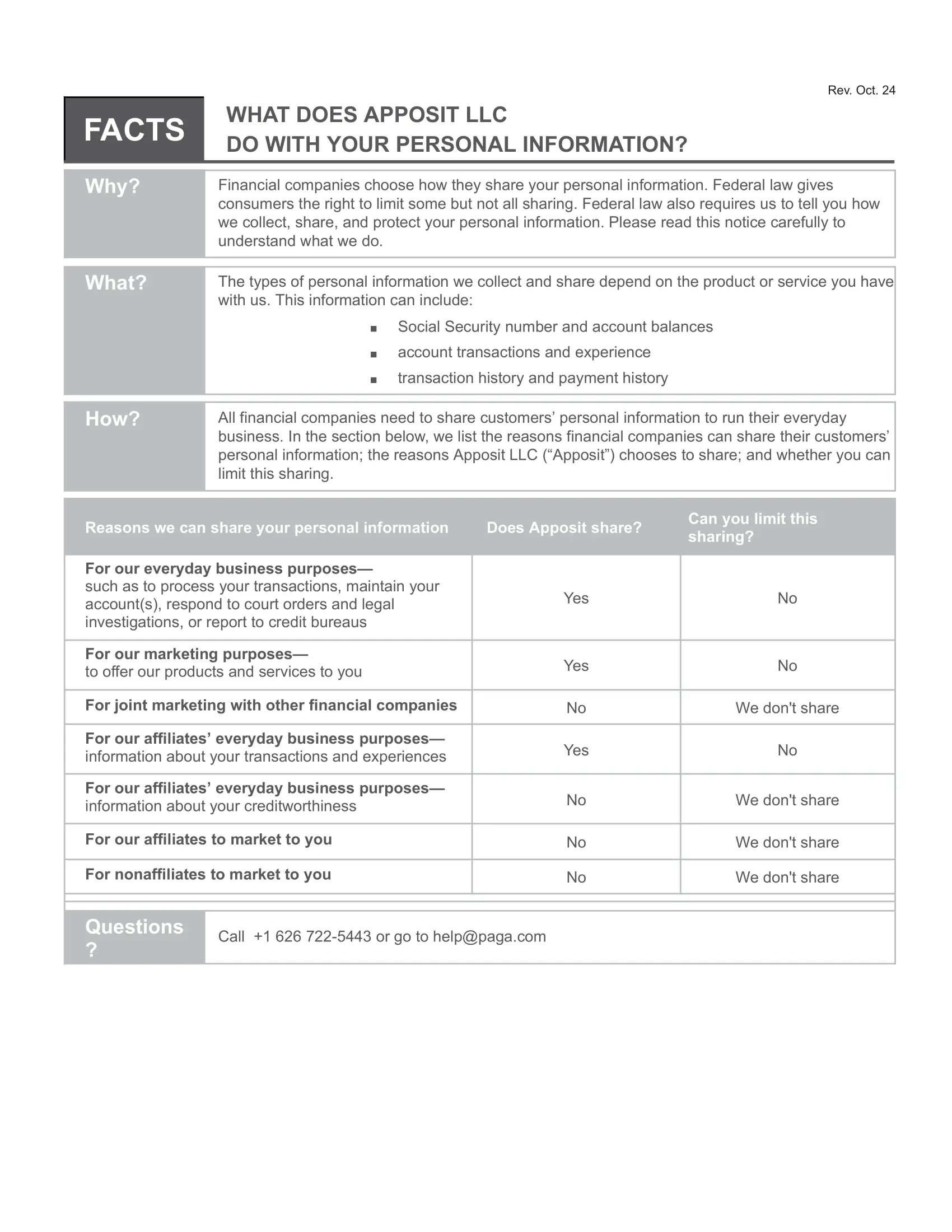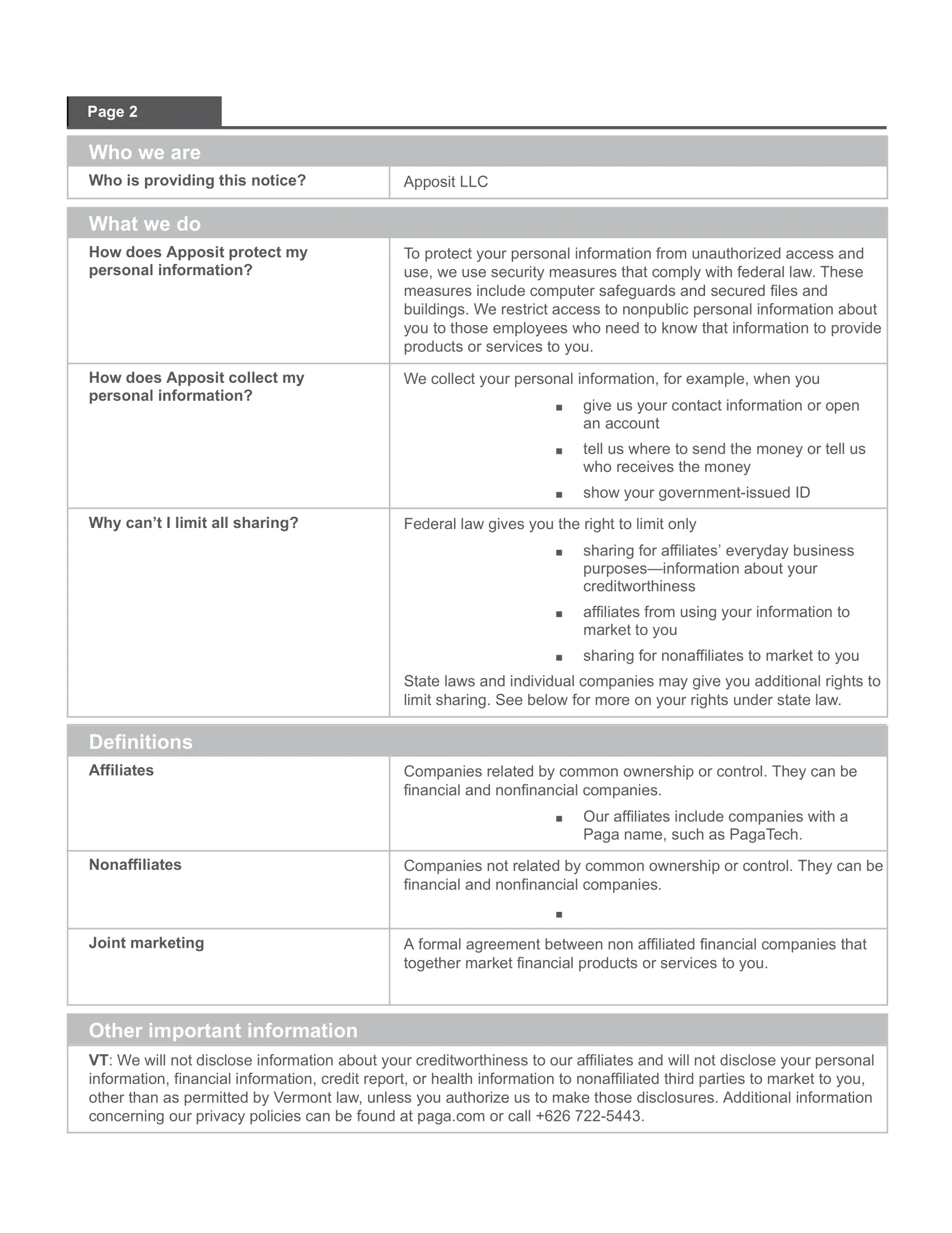 This Electronic Communication Disclosure and Agreement ("the E-Sign Consent") is a legally binding agreement between Apposit LLC D/B/A Paga and its subsidiaries, affiliates, agents and assigns (collectively, "Paga”), and you ("you," "your") regarding your use of Services offered, operated or made available by Paga or Regent Bank, including as the Services offered (collectively, the “Services”), operated or made available by Paga through its website, including www.paga.com and any subdomain, or mobile application (collectively, the “Website”). The terms “we”, “us”, and “our” refer to Paga and Regent Bank, collectively.
